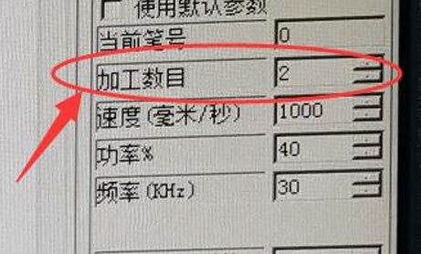 在软件的右侧参数中,将“使用默认参数”去掉勾选。在下方有一个“加工数目”,我们把这个加工条目改成2,这样激光打标机就是一次打两遍。你可以设置任意意数,设置的数字是多少,就是一次打多少遍。比如 :改成10,就是…